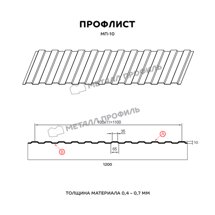 МП-10 – один из классических видов стенового профнастила. Он уместно подходит в виде декоративного ограждения, вентилируемого фасада, подвесного потолка в нежилых помещениях, стенового материала, забора. Профиль отличается трапециевидной формой волны, аналогичной на сторонах А и В. Высота трапеции – 10 мм, это не даёт металлопрокату высокой способности выдерживать большие нагрузки, но при облицовке фасадов это не самое главное. Зато минимальный рельеф профиля не создаёт зданию индустриальный облик. На технические характеристики можно воздействовать, заказав ту или иную толщину стройматериала. МП-10 изготавливается в вариациях от 0,4 до 0,7 мм. Повысить защиту от ржавчины поможет финишный полимерный слой. Он не только отличается богатым цветом, стойким к выгоранию под УФ-лучами, но и предупредит мелкие физические повреждения и ржавение стали.